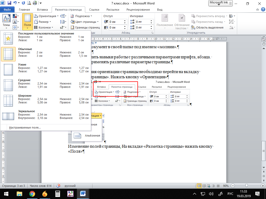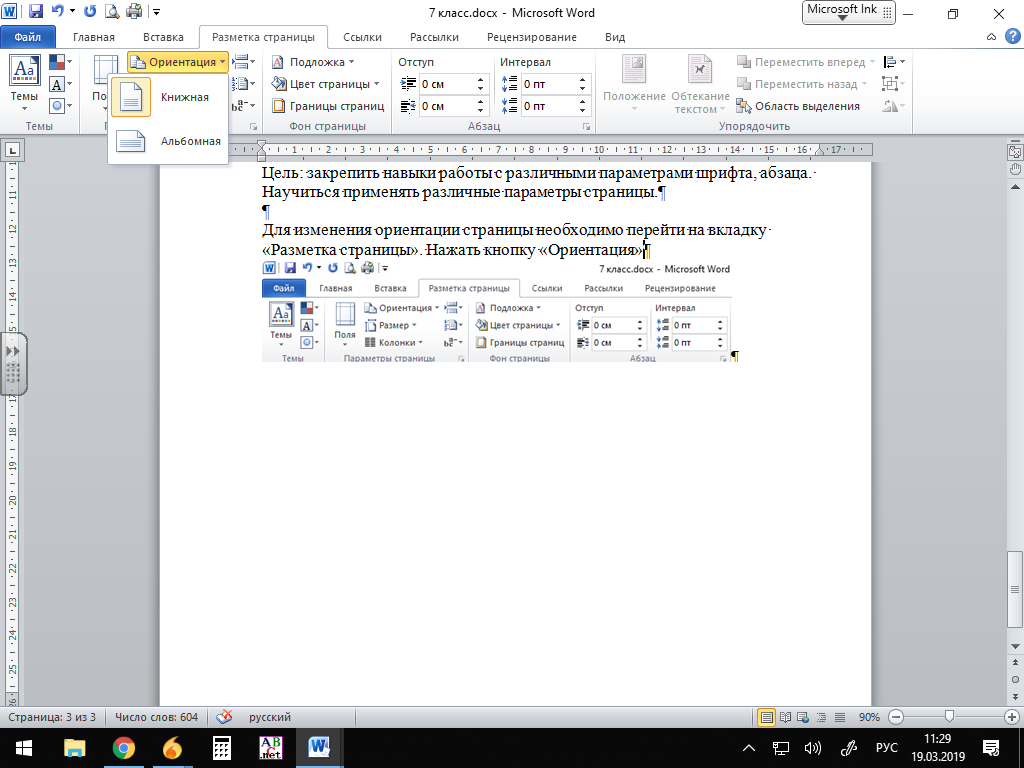 Файл/Параметры страницы/ Размер бумаги (размер бумаги – А4; ориентация листа – Книжная)