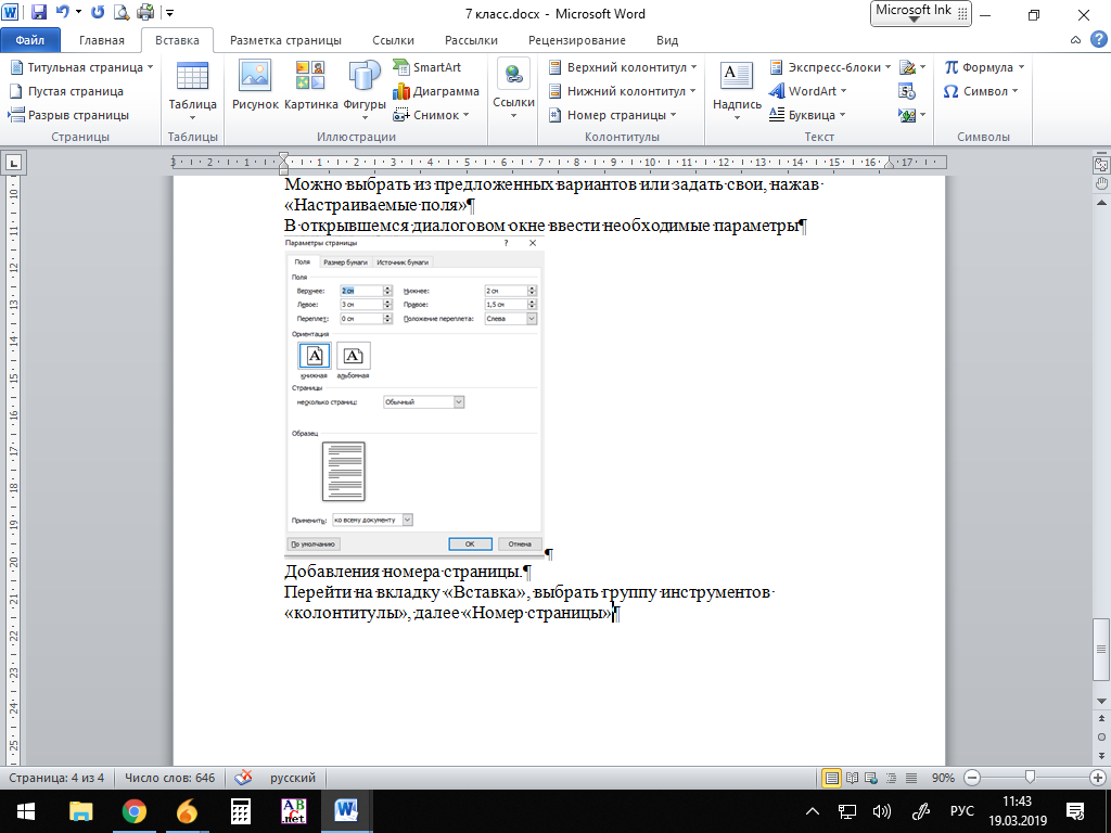Файл/Параметры страницы/Поля (левое – 1,5 см, правое – 1,5 см, верхнее – 1,5 см, нижнее – 1,5 см).