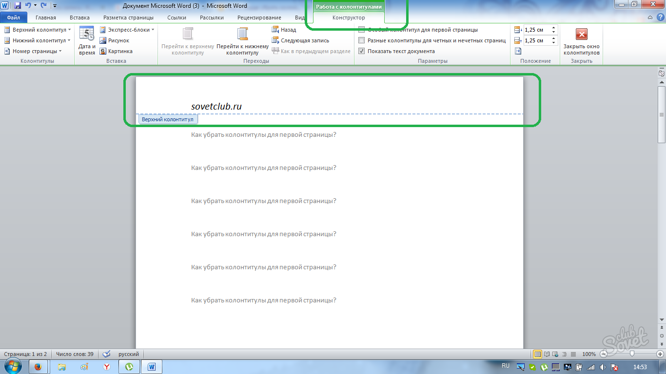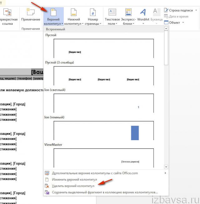 Удаление верхнего колонтитула