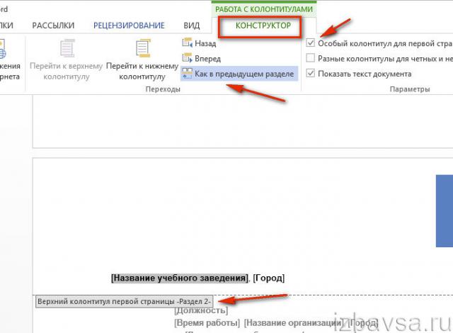 5. В разделе «Конструктор» кликом левой кнопки отключите настройку «Как в предыдущем разделе», для того чтобы убрать связь между разделами.