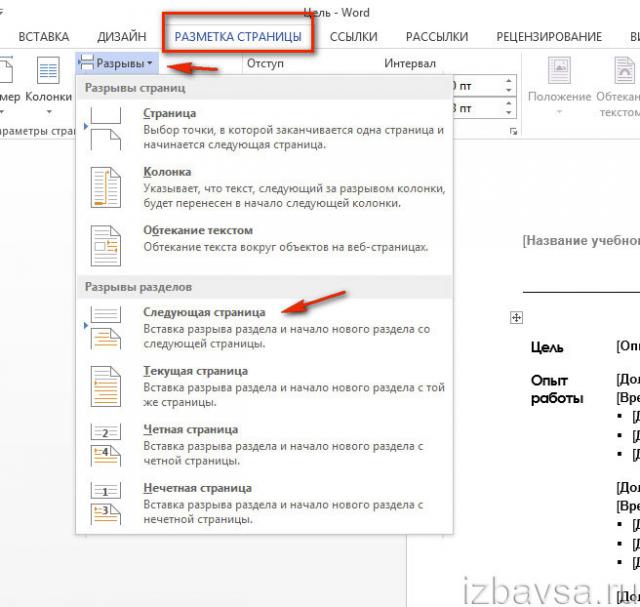 2. На вкладке «Разметка страницы» кликом мыши откройте подменю «Разрывы».