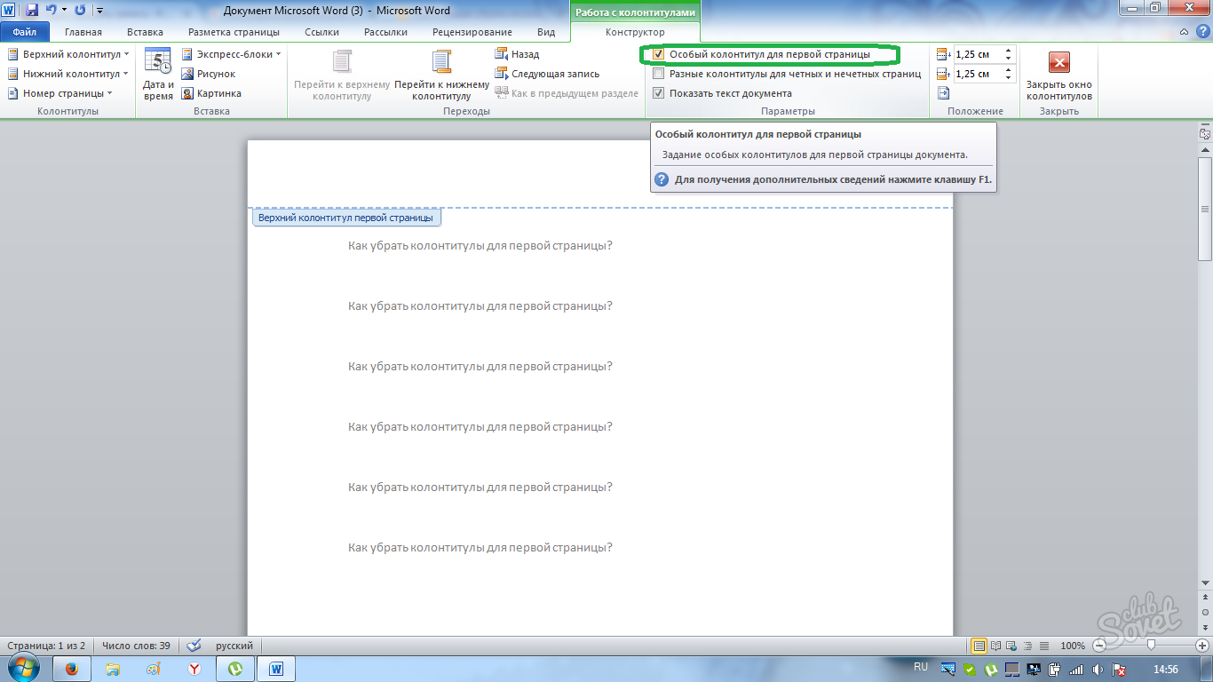 Как убрать колонтитул с первой страницы документа