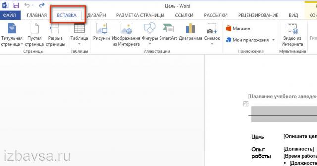 1. Откройте в меню Word кликом мышки раздел «Вставка».