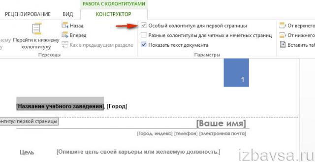 После первого использования колонтитула в Ворде 2010 и 2007 появится новая вкладка «Конструктор». С помощью данного раздела, с легкостью сделать первую страницу без колонтитулов. Для того чтобы первый лист документа был без колонтитулов надо поставить галочку «Особый колонтитул для первой страницы» во вкладке «Работа с колонтитулами». Следовательно, установленный верхний колонтитул сдвинется на лист ниже. Последовательно по этапам, если нет раздела «Работа с колонтитулами»: «Вставка» — «Верхний/Нижний колонтитул» – «Изменить» — «Вкладка Конструктор» — "Особый колонтитул для первой страницы».