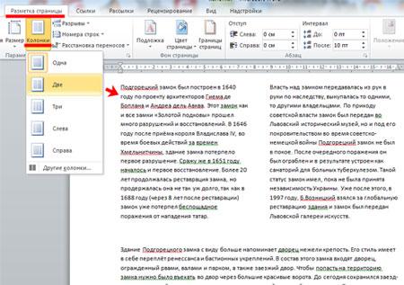 Чтобы использовать функцию «Колонки», нужно нажать на кнопку «Колонки», которая находится на панели инструментов раздела «Макет страницы». Появится выпадающее меню, в котором мы можем выбрать количество колонок, которое нам необходимо.
