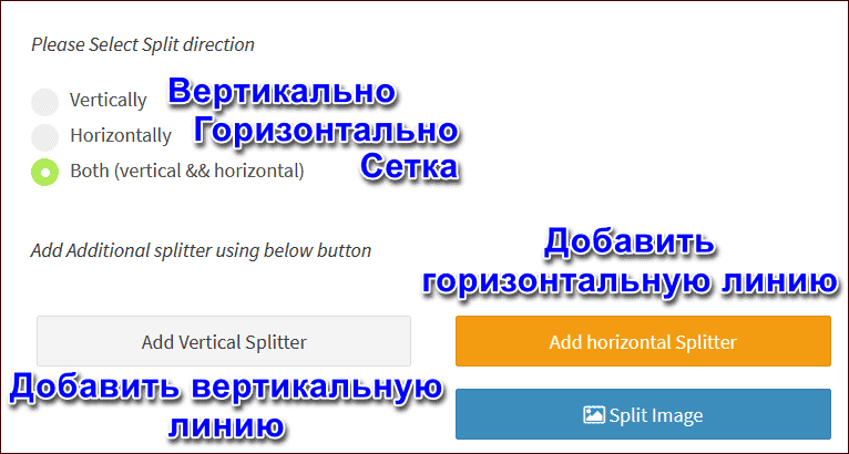 - Укажите на сколько частей хотите разделить фото (в поле рядом с надписями «горизонтально» и «вертикально» задайте число блоков, на которые хотите поделить рисунок).