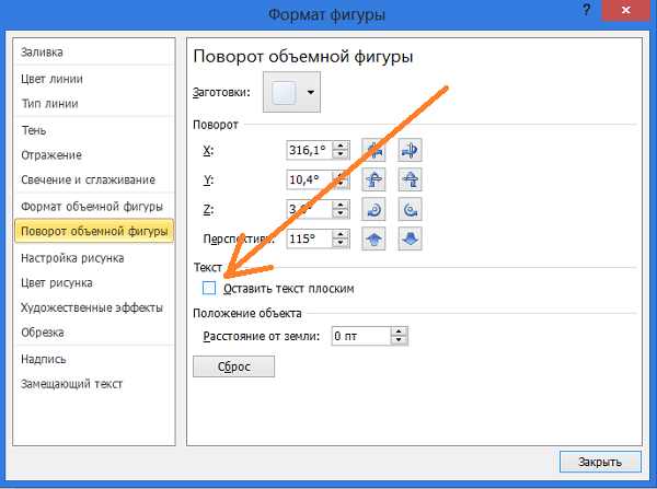 Ну и в заключении сегодняшнего разговора о том как повернуть текст под углом, а также как наклонить текст, хочу обратить внимание на важный момент. Для того чтобы мы крутили текстом как пиццайоло тестом, в квадратике с названием «Оставить текст плоским» не должно быть галочки: