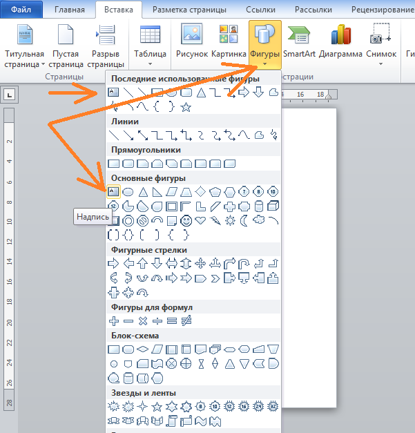 Итак, инструмент «Нарисовать надпись» находится в разделе набора фигур «Основные фигуры». Если мы однажды воспользовались данным инструментом или какой-то фигурой, то эти фигуры отражаются в верхнем разделе, с названием «Последние использованные фигуры».