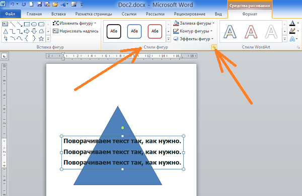 Для того чтобы в этом окошке оказаться ещё быстрее, нам нужно щёлкнуть левой кнопкой мыши внутри текста для его выделения, а затем нажать маленькую стрелочку в правом нижнем углу раздела «Стили фигур»: