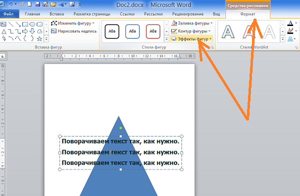 Для того чтобы вертеть текст так, как нам только того захочется, мы должны, не покидая и не сворачивая вкладку «Формат» верхнего меню, обратиться к опции «Эффекты фигур»: