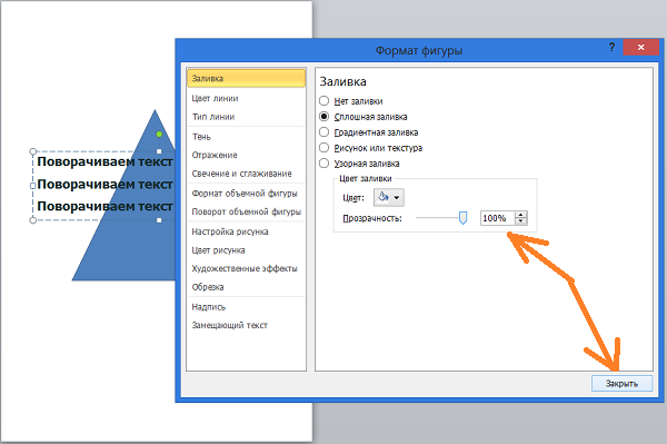 Такой вариант не всегда может нас устроить, по той причине, что под «нет заливки» подразумевается отсутствие заливки цветом отличным от белого цвета, а также градиентной заливки и заливки текстурой. То есть, поле, как было белого цвета, таким оно и осталось. В данном конкретном случае это ненужное действие. Сейчас я размещу под текстом треугольник, и мы в этом убедимся:
