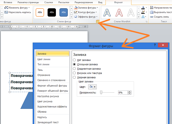 Если поле текста не выделено, то щелчком мыши в области текста, выделим его (поле захватили маркеры). Щелчком левой кнопки мыши по стрелочке в нижнем правом углу раздела «Стили фигур» вкладки «Формат», развернём окошко дополнительных настроек поименованное «Формат фигуры»: