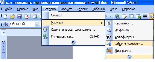 Нажимаем «Вставка», затем – «Рисунок», затем «Объект WordArt».