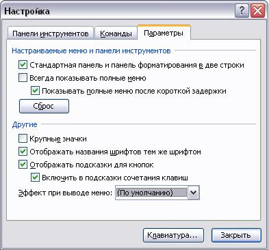 Третья закладка Параметры в диалоговом окне Настройка вполне доступна для изучения пользователю самостоятельно и позволяет установить дополнительные возможности при работе с Меню и значками (см. Рис.).