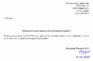 Посмотрите образец объяснений сотрудника, который опоздал на работу по уважительной причине.
