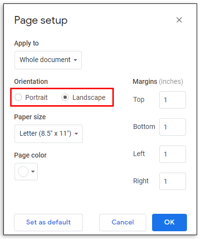 Если вы думаете, что альбомная ориентация будет использоваться чаще, чем портретная опция, и предпочитаете не выполнять эти шаги каждый раз, вы можете установить альбомную ориентацию в качестве ориентации по умолчанию. Все, что нужно сделать, — это нажать на нижнюю кнопку «Установить по умолчанию» в нижней части окна «Параметры страницы», прежде чем нажать «ОК».