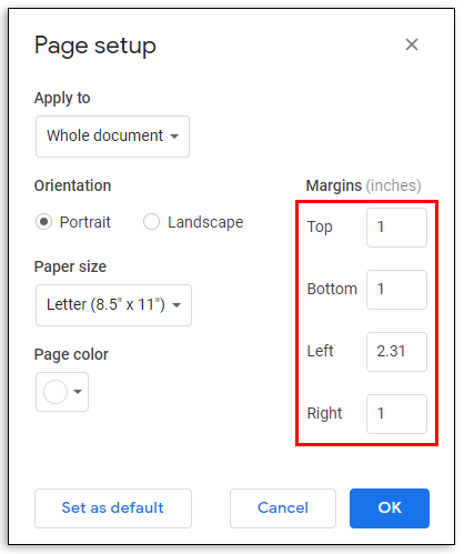 - Существует несколько других параметров, которые можно настроить, включая поля (в дюймах), размер бумаги и цвет страницы. >