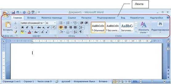 При запуске программы Word 2007 открывается окно приложения (Рис. 2.1.1.1), в окне документа (в окне редактирования) которого отображается пустой Документ 1. По умолчанию приложение открывается на вкладке Главная, на которой отображаются все требуемые средства для ввода текста или вставки текста из буфера обмена, его редактирования и форматирования.