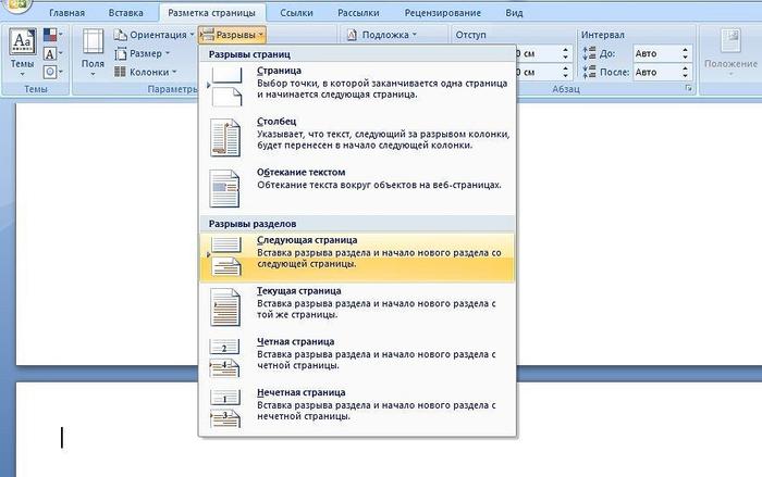 - В разделе «Раздел» выберите «Разрыв страницы».