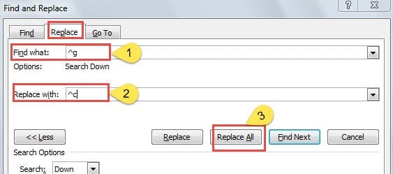 Команда ^g код появится в Найти то, что текстовое окно. Нажмите Заменить все.