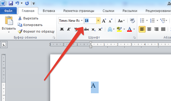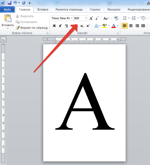 Шаг 3. Далее на верхней панели инструментов на вкладке главная в поле выбора размера шрифта поставить курсор мыши, стереть старое значение и вписать новое и нажать ENTER. Например, чтобы буква получилась на весь лист, можно взять любой диапазон от 600 до 700.