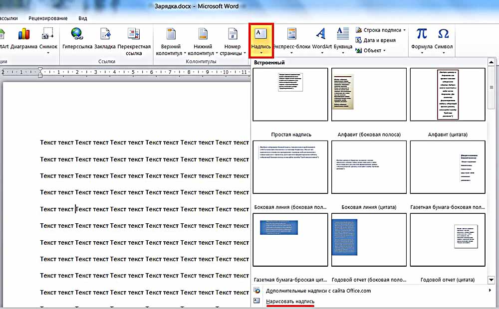 Текстовое поле – надпись, представляющая собой цитату или примечание к документу. Её можно добавить в любое место документа. Для этого – перейти на вкладку «Вставка», и в группе «Текст» открыть выпадающий список «Надпись».