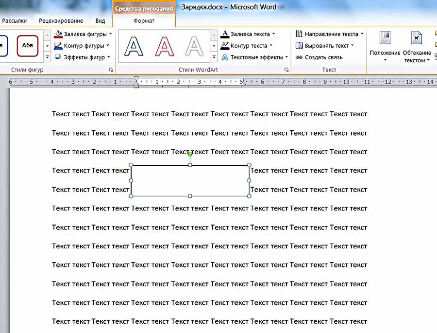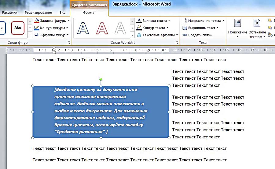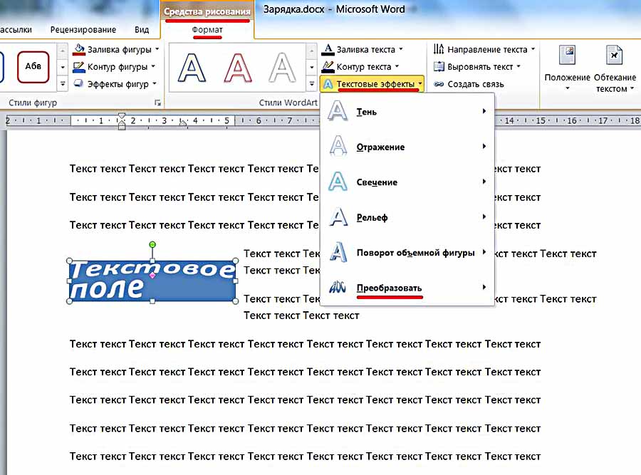 Одновременно с текстовым полем в Word появляется новая вкладка «Средства рисования/Формат», содержащая множество инструментов для преобразований созданного текстового поля. В качестве примера на следующем скриншоте показан результат редактирования текстового поля посредством инструмента «Текстовые эффекты/Преобразовать».