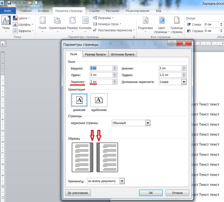Также здесь можно изменить размер дополнительных отступов, которые используются для переплета документа. Эти опции называются « Переплет » и « Положение переплета ».