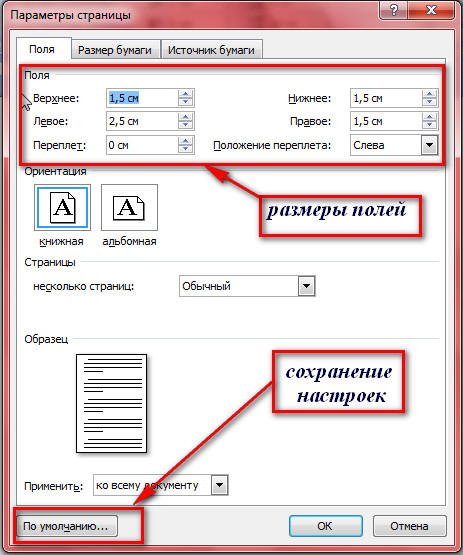 В ворде имеется замечательная функция, называемая «по умолчанию», при применении которой имеющиеся в настоящий момент настройки сохраняются и используются при создании новых текстовых файлов. Эта же функция доступна и из окна настройки полей (рисунок ниже). Наличие «умолчания» облегчает нам жизнь, поскольку, как уже говорилось выше, большинство создаваемых нами документов имеет одинаковые настройки параметров.