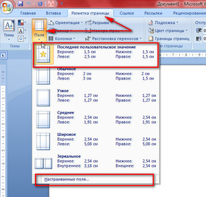 В ворде 2007 и более поздних версиях настройки полей («Поля») располагаются во вкладке «Разметка страницы» (см. рисунок ниже). При нажатии на эту кнопку мышью открывается список различных вариантов полей, в котором первым располагается последнее использовавшееся значение. Это удобно, поскольку большинство документов (рефератов, курсовых и т.д.) оформляется под одни и те же требования.