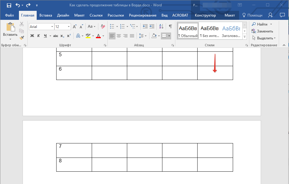 1. Установите курсор в последней ячейке последней строки той части таблицы, которая находится на первой странице. В нашем примере это будет последняя ячейка строки под номером 6 .