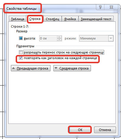 То же самое можно сделать, воспользовавшись окном «Свойства таблицы» . Чтобы открыть его, выделяем всю таблицу, кликаем по ее полю правой кнопкой мыши, в выпадающем меню находим нужную нам строчку. В окне переходим во вкладку «Строка» и отмечаем галочкой «повторять как заголовок на каждой странице» (рис. 7).