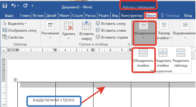 Далее во вновь добавленной строчке нужно объединить ячейки. Для этого выделяем строку, в той же вкладке «Макет» заходим в раздел «Объединение» и нажимаем на кнопку «объединить ячейки» (рис. 5). После этого в образовавшейся большой ячейке вводим название таблицы, выставляем его по центру и форматируем текст.