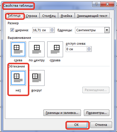 В этом случае нужно просто еще раз открыть окно «Свойства таблицы» и зайти теперь во вкладочку «таблица» . Обратите внимание на группу «Обтекание» . Выбирайте кнопку «НЕТ» , она должна быть активирована (см. рис. 8). Только тогда вы сможете продублировать шапку таблицы на последующие страницы.