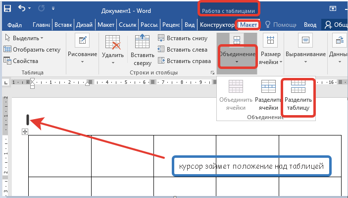 - в разделе «Объединение» кликаем по кнопке «разделить таблицу» (рис. 3).