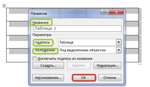 В третьей строчке «положение» нам предоставляется возможность выбора: разместить заголовок таблицы сверху или под ней. ГОСТ допускает оба варианта. После заполнения всех необходимых граф не забудьте нажать кнопку «ОК» .