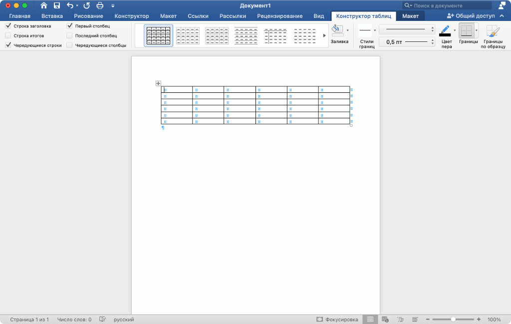 Шаг 2. Перейдите в раздел «Вставка» в верхнем ленточном меню приложения, нажмите на кнопку «Таблица» и выберите возможность «Вставить таблицу».