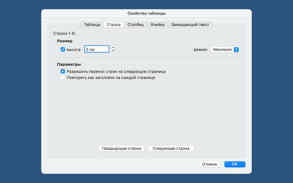 Шаг 2. Перейдите в раздел «Строка» и выберите высоту ячейки с помощью поля «Высота».