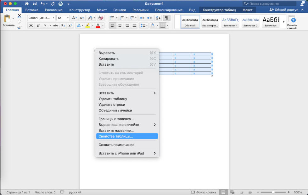 Шаг 1. Наведите курсор на таблицу, нажмите на кнопку в виде крестика в ее левом верхнем углу правой кнопкой мыши и выберите пункт «Свойства таблицы».