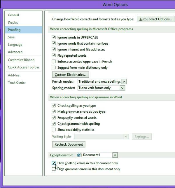 Кардинальный способ избавиться от цветных волнистых линий — отключить автопроверку текста. Выполняется эта операции через окно настроек программы. В версии 2007 — щелчок мышкой по логотипу Office, в новых версиях — переход в меню "Файл". Далее необходимо на вкладке "Правописание" убрать отметки в полях «Скрыть ошибки».