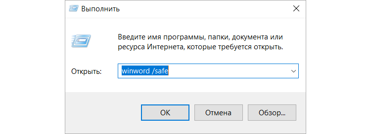 Для примера приведено приложение Microsoft Office Word. Нажмите сочетание клавиш Win + R, чтобы открыть окно Выполнить. Введите winword /safe в строке поиска, затем нажмите Enter. Затем создайте новый файл или откройте файл, при открытии которого возникла ошибка, и проверьте, решена ли проблема.