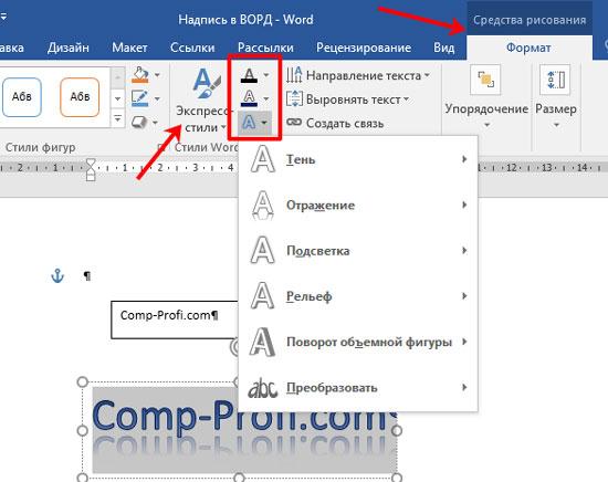- На панели инструментов Word найдите кнопку «Эффекты текста» или перейдите во вкладку «Текстовые эффекты».