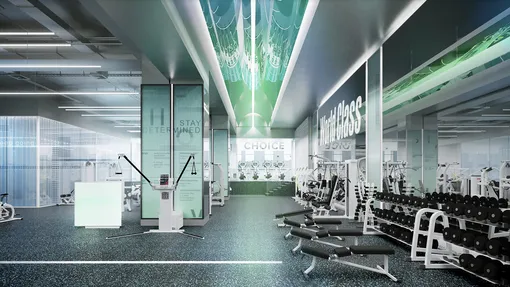 В тренажерном зале выделены зоны свободных весов, блочных и нагружаемых тренажеров, растяжки, кардиозона и отдельное пространство для высокоинтенсивных тренировок, где соединятся боевые искусства, функциональный тренинг (TRX, механические дорожки, гребные тренажеры), пауэрлифтинг и тяжелая атлетика.