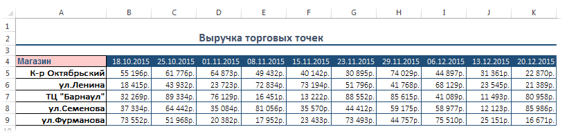 Скачать пример из видеоурока: (47,5 KiB, 1 017 скачиваний) Вводные данные: имеется таблица с данными по выручке от продаж на нескольких торговых точках: