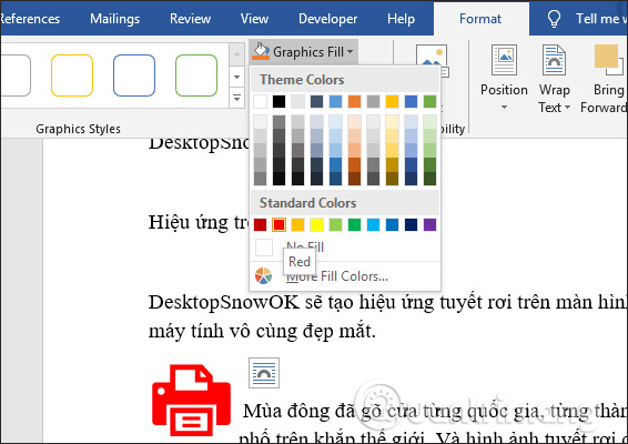Значки Word содержат множество различных тем, поэтому пользователи могут свободно выбирать вставку содержимого. Значок также имеет параметры положения, цвета, эффектов и т. Д., Аналогичные вставке фигур в Word. Обратите внимание, что для использования этой функции компьютер должен быть подключен к Интернету.