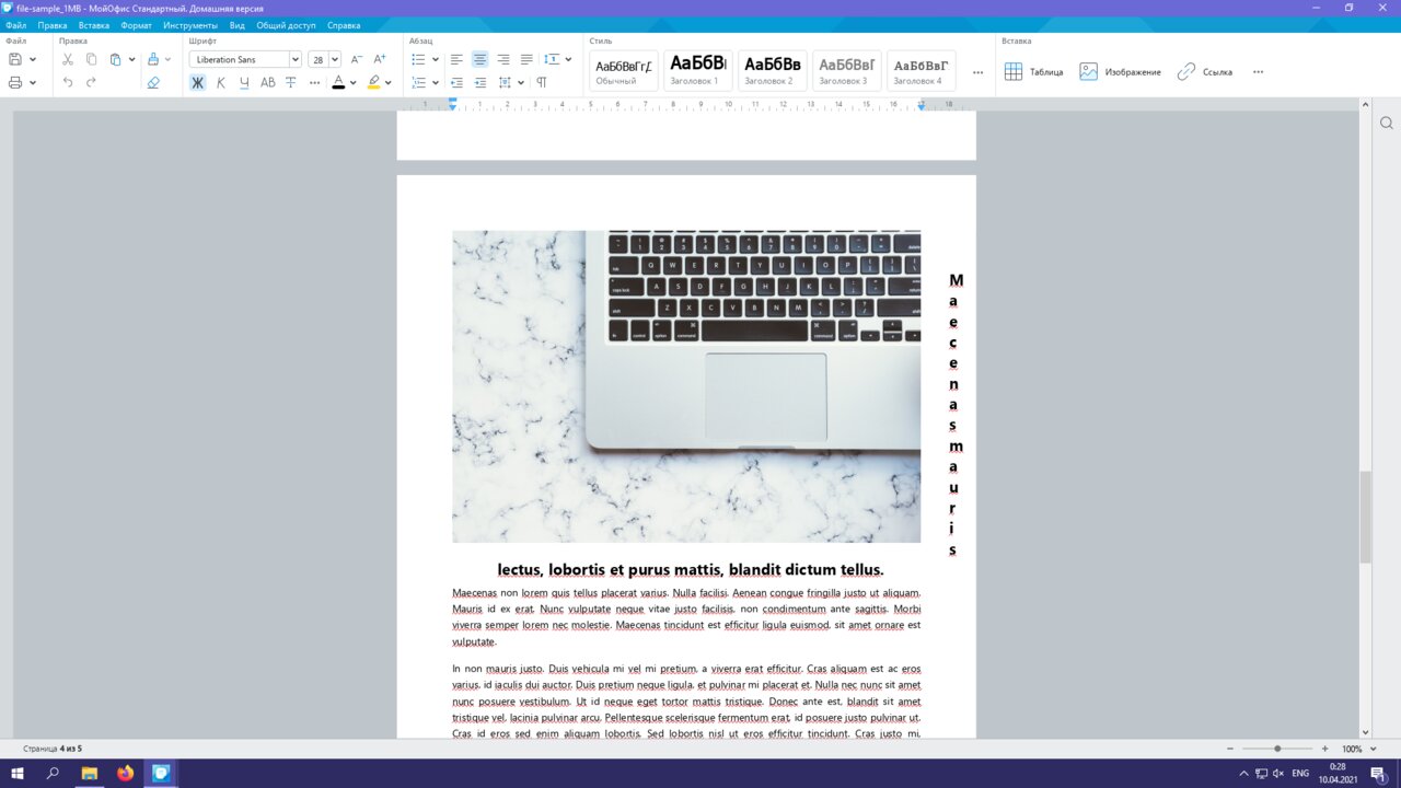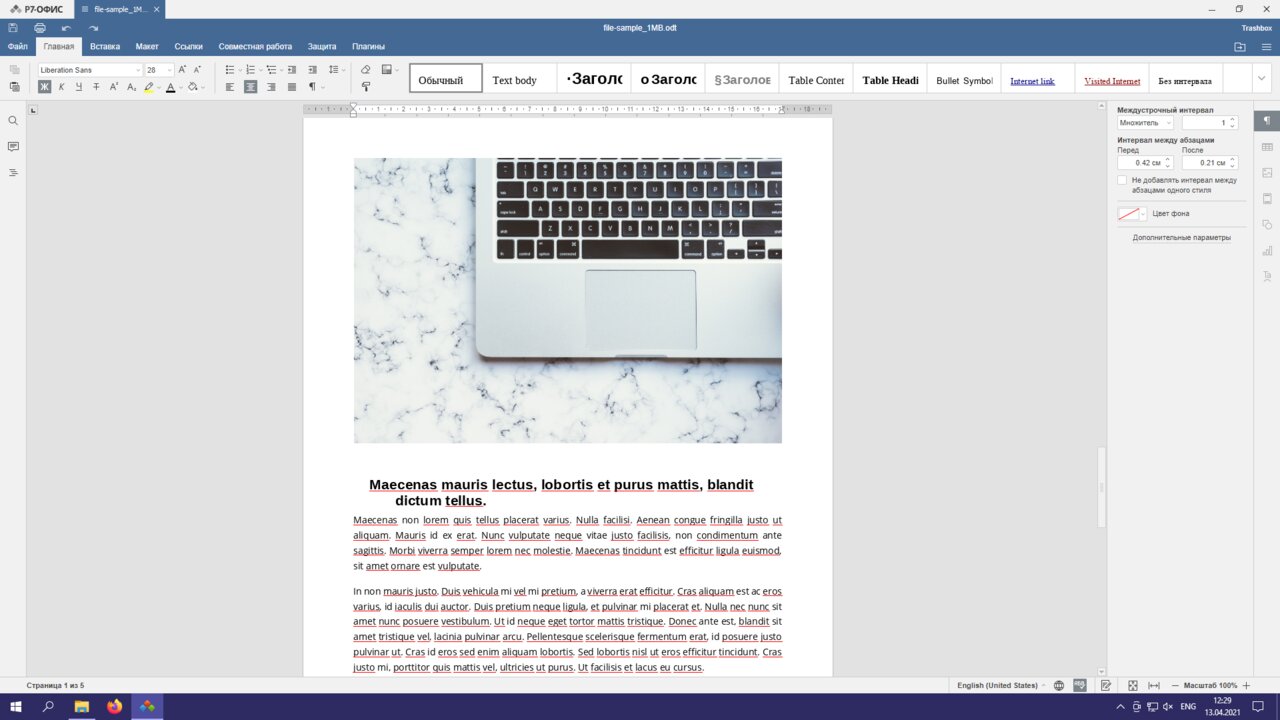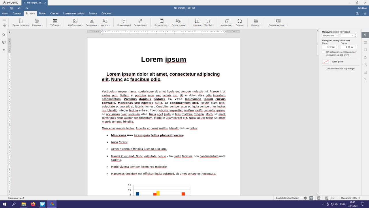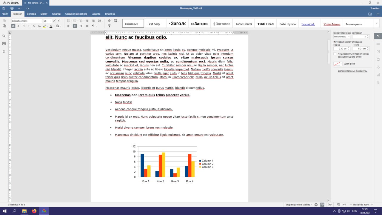 На практике хорошо себя зарекомендовал лишь «P7-Офис». Я пробовал открыть сэмпл-файлы формата DOCX, DOC, ODT и RTF — все опробованные документы открылись без ошибок. «МойОфис» явно не в фаворитах — в половине файлов съехала вёрстка, в другой половине «сломались» диаграммы — они не поддерживаются в текстовом редакторе.