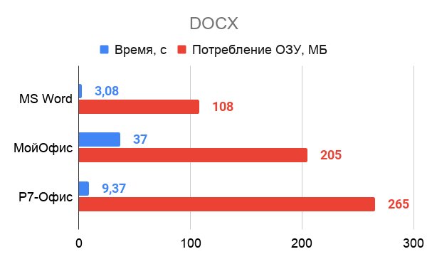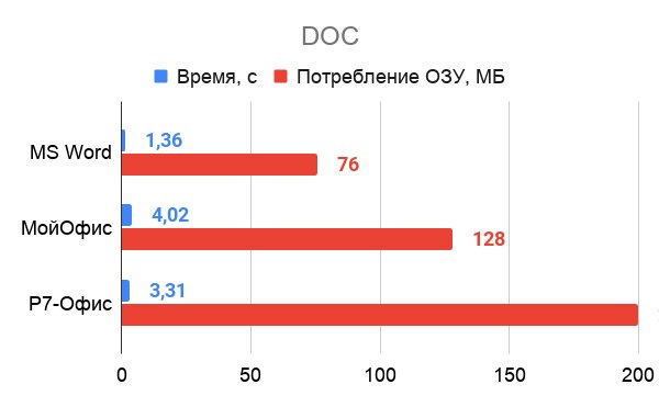 Я измерил скорость открытия документов формата DOCX размером 13 МБ, DOC, ODT, RTF размером по 1 МБ каждый, XLS и XSLX с 5000 строк. Секундомер останавливался только тогда, когда файл был открыт полностью.