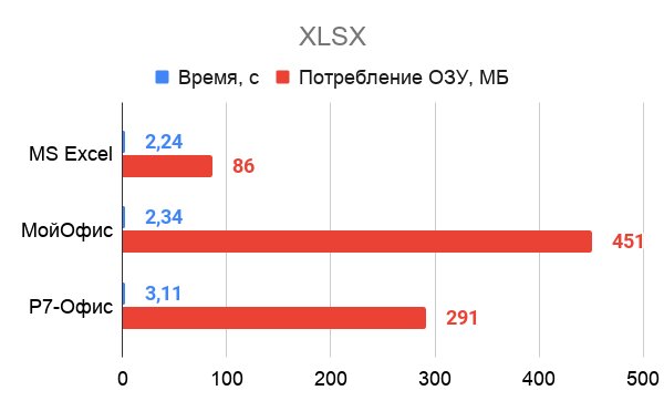 «МойОфис» в среднем потребляет меньше памяти, чем отечественный собрат, но открывается намного медленнее. Строки в таблицах так вообще подгружаются на ходу, в отличие от других офисов, а документ формата XSLX заставляет приложение потреблять почти полгигабайта ОЗУ.