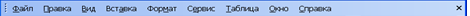 Пункты которые располагаются на стоке меню Файл, Правка, Вид, Вставка, Формат, Сервис, Таблица, Окно и Справка.