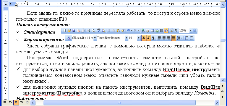 В рабочем поле окна Word отображается содержимое документа: текст, таблица, рисунки. Если текст, таблица, рисунок большой и не все помещается в области рабочего поля, то будут образовываться так называемые полосы прокрутки, с помощью которых можно просмотреть содержимое всего документа.